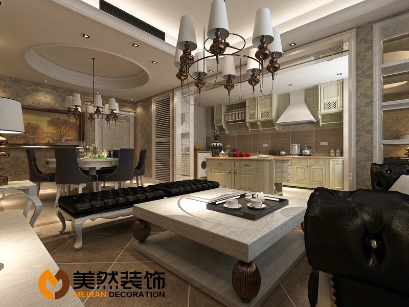 “美式風格不僅僅是一種風格,更是一種對生活的態度,它是有溫度的、有態度的、積極向上的,與業主理想中的家很貼切。”為了考慮衛生間的功能使用,把洗衣機設計在廚房,使整體感簡潔明了。與過道交接處開了一個直線埡口,這樣在廚房里也能第一時間知道家人回來了。